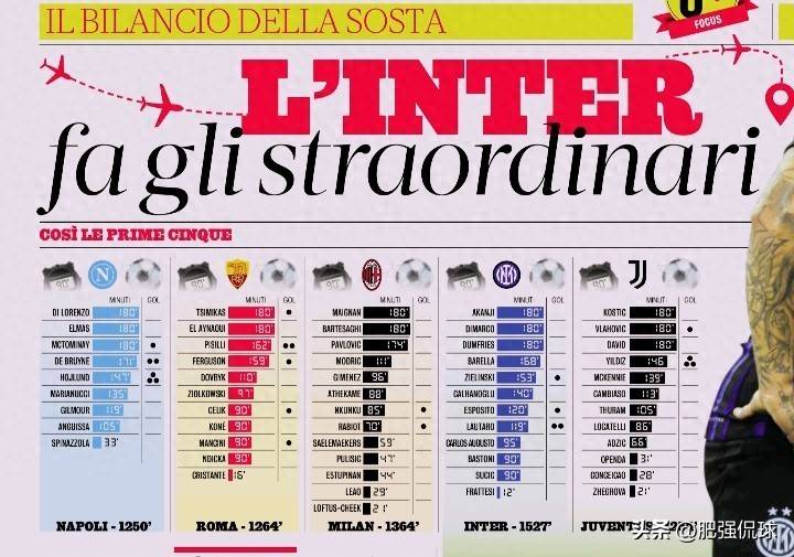 不过,从国脚数量来看,国际米兰的球员并非最多,他们和尤文图斯一样都是12名国脚,AC米兰最多有13名,罗马有11名,那不勒斯则有9名。但如果按人均出场时间来算,国米排在第二,最高的是那不勒斯,他们的国脚平均出场时间为138.9分钟,而国米为127.25分钟。罗马排在第三(114.9分钟),AC米兰和尤文的国脚分别为104.92分钟和104.5分钟。从整体来看,国际米兰的球员在国际比赛日的比赛消耗是最多的,无论是总出场时间还是人均时间都占据了高位。