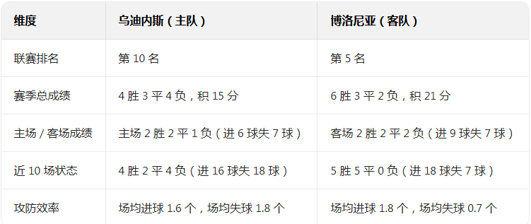意甲直播,意甲赛程,意甲积分榜,尤文图斯直播,意甲比分预测/面向中文球迷的意甲资讯平台,涵盖2025赛季完整赛程、免费高清直播入口、积分榜更新与竞彩波胆预测,聚焦尤文、国米、米兰三大豪门赛事。2025 年 11 月 22 日 22:00,意甲第 12 轮焦点对决(周六 019 场次)即将上演,联赛第 10 名的乌迪内斯将坐镇主场,迎战排名第 5 的劲旅博洛尼亚。一边是主场韧性尚可但防守不稳的 “神经刀”,一边是不败势头强劲却深陷伤病与多线作战的 “黑马”,再叠加两队历史交锋的 “平局魔咒”,这场对决的走势充满悬念。以下结合球队核心数据、状态及伤病情况,展开胜平负、比分、进球数、半全场全维度预测解析。