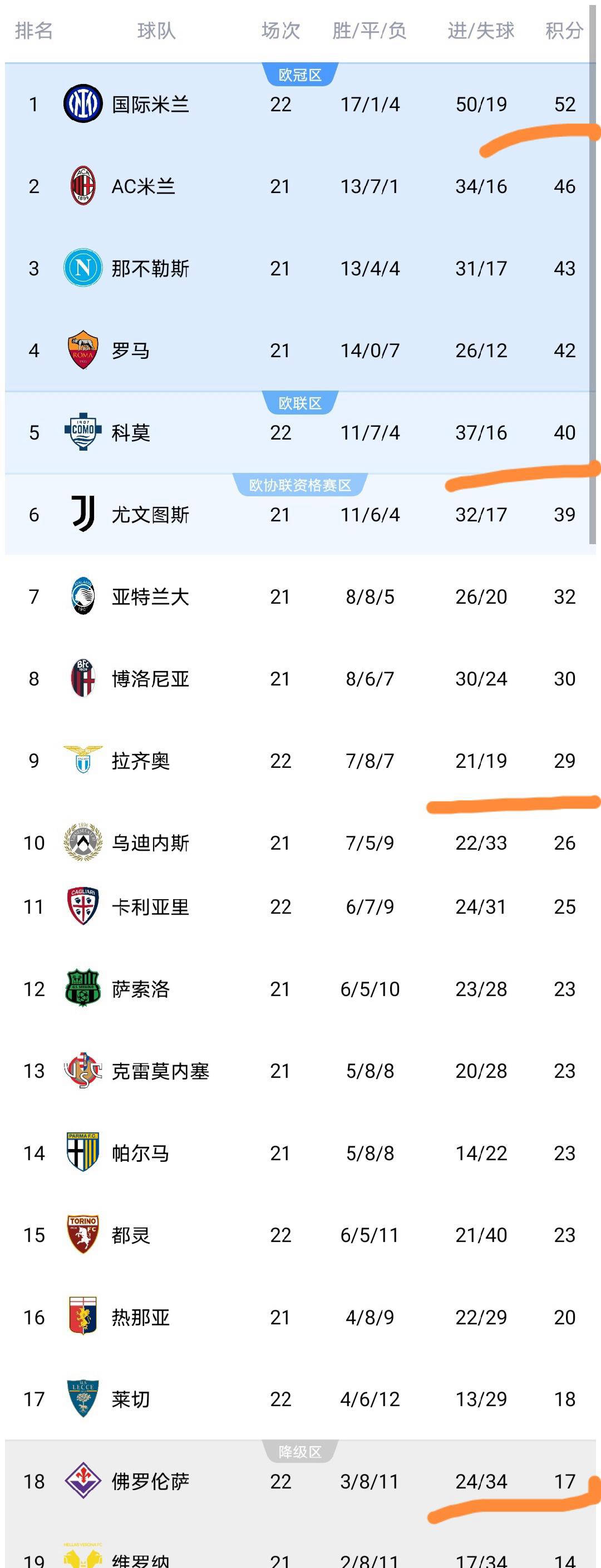 目前积分榜首依然由国米稳稳占据,尚未进行第22轮的AC米兰、那不勒斯、罗马和尤文图斯暂未改写排名。特别是国米,基本锁定榜首位置,只要自己不出现严重失误,其它球队几乎难以撼动其冠军地位。