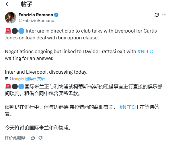 罗马诺在X(推特)上表示:“国际米兰正与利物浦就柯蒂斯·琼斯的租借交易进行了俱乐部层面谈判,该交易包含购买选择权条款。谈判正在进行中,但与弗拉泰西的离队相关,诺丁汉森林正在等待答复。”