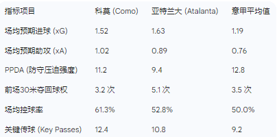 在现代足球分析中,高阶数据提供了传统数据无法捕捉的战术效率维度。科莫与亚特兰大的对比,本质上是“阵地控球效率”与“高强度逼抢转换”的碰撞。