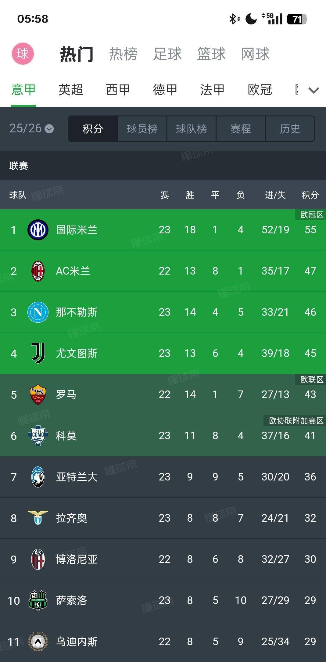 真正的激烈和不确定性,全部浓缩在了欧冠资格的争夺上。 从第三名的罗马(43分)到第六名的球队(39分),分差只有区区4分。 这意味着每一轮比赛的结果,都可能让积分榜中上游的排名发生剧烈变动。 那不勒斯在输给尤文后,卫冕希望已极其渺茫,他们的目标已转为保住欧冠席位。 而像亚特兰大、以及本赛季异军突起的科莫(进攻和防守数据均位列意甲第二),也都有能力加入这场混战。
