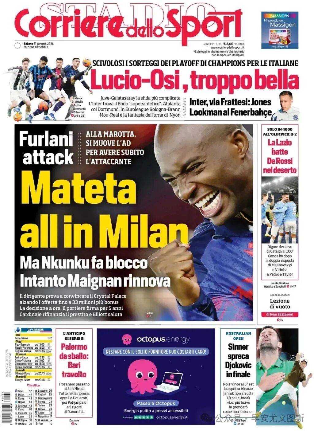 2、斯帕莱蒂-奥斯梅恩,太漂亮了。欧冠附加赛,对意大利的球队来说都有麻烦。尤文-加拉塔萨雷,最复杂的战斗。国米面对“超级合成”的博德闪耀。亚特兰大对阵多特蒙德。博洛尼亚在欧联杯面对布兰。在尼翁的抽签,穆里尼奥与皇马是最梦幻的决斗。