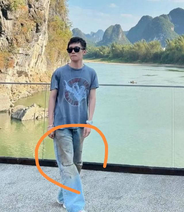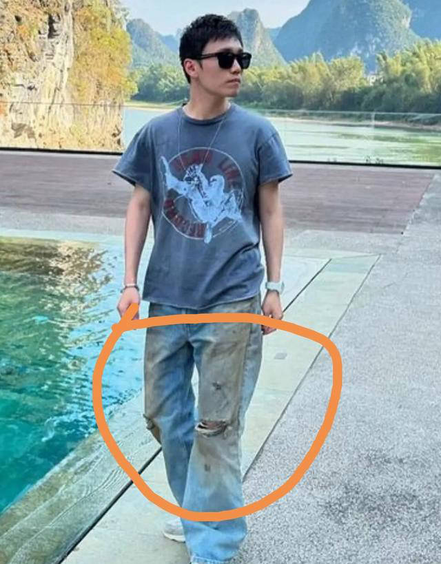 我们可以看到张康阳戴着一副黑色墨镜,穿着一件深蓝色T恤,T恤上印有一个很大的图案。左手戴着手表,右手则戴着手链。然后重点来了,他穿着一条看起来相当脏乎的牛仔裤,仿佛是刚从泥坑中爬出来的样子, 裤子上沾满了泥土。此外,他还挎着一个大包,看起来有些像外出务工人员回家的模样。