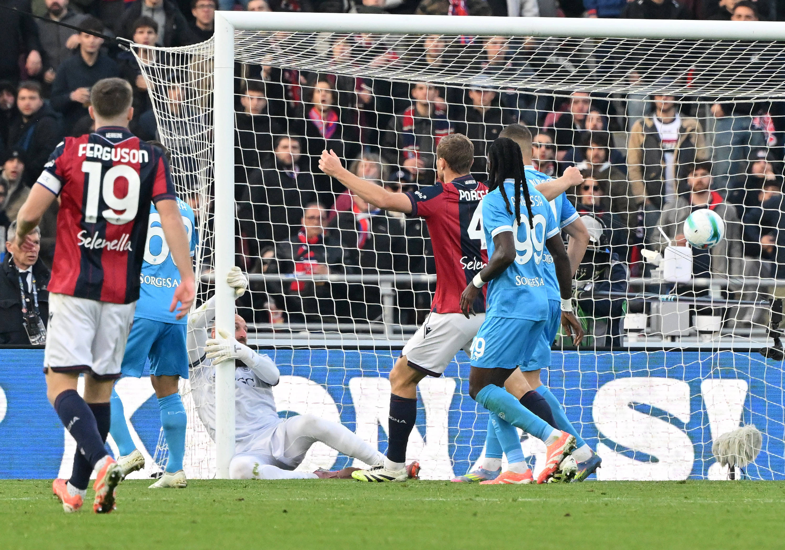 11月9日,那不勒斯队守门员米林科维奇-萨维奇(左三)未能扑出博洛尼亚队球员达林加的射门。 新华社发(阿尔贝托·林格利亚摄)