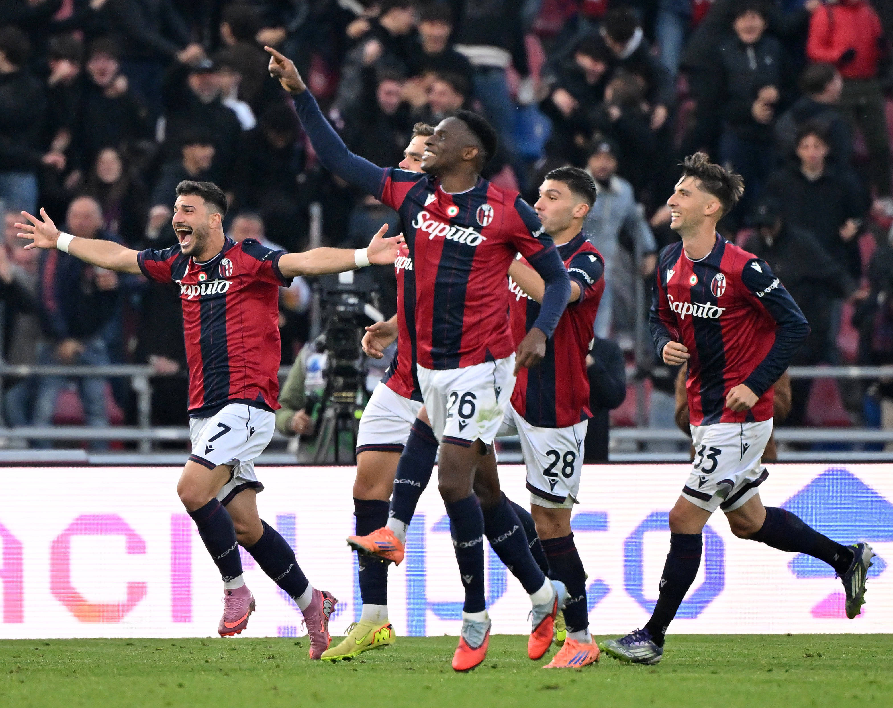 11月9日,博洛尼亚队球员在赛后庆祝。 新华社发(阿尔贝托·林格利亚摄)