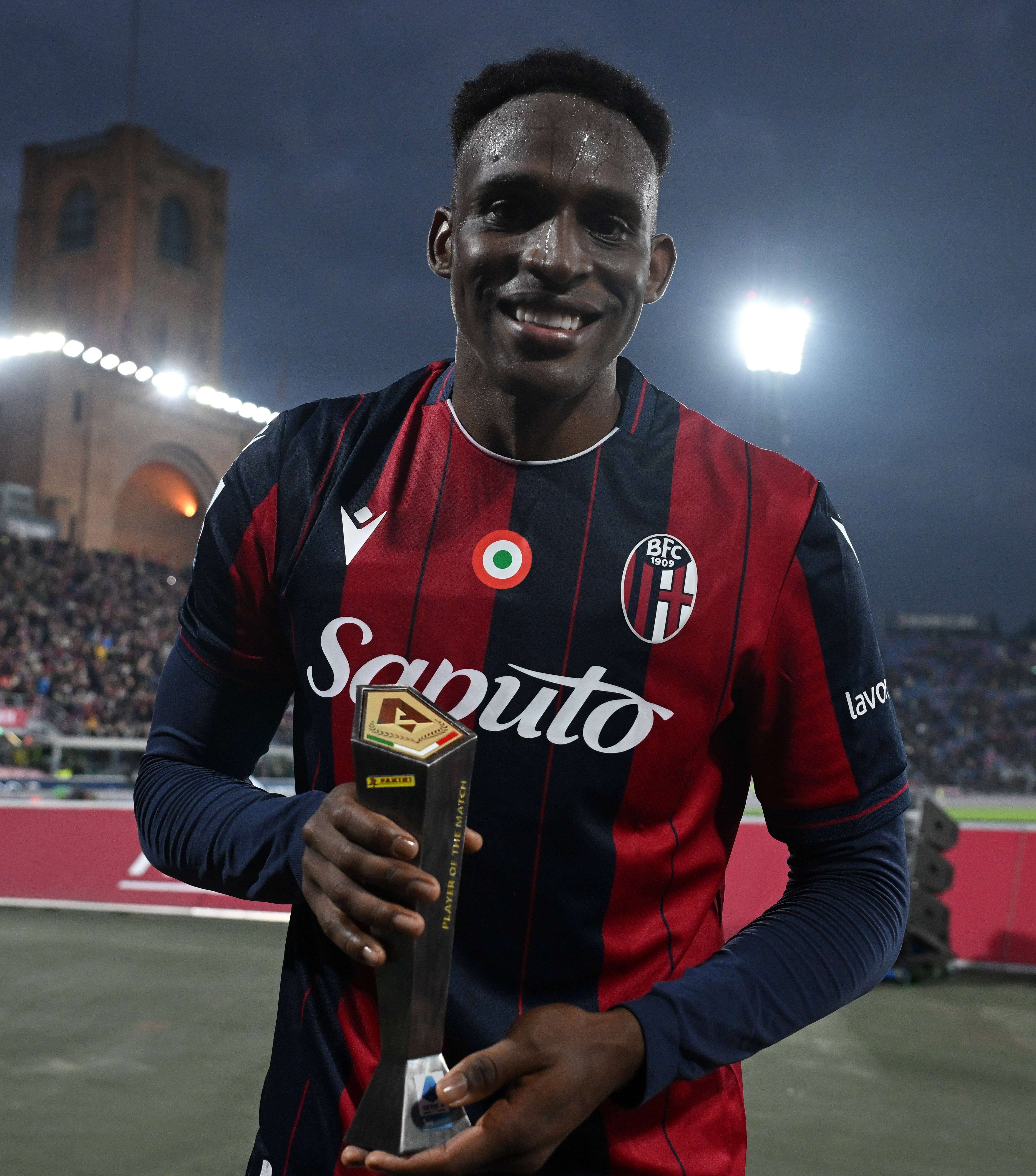 11月9日,博洛尼亚队球员卢库米在赛后获颁本场最佳球员奖杯。 新华社发(阿尔贝托·林格利亚摄)