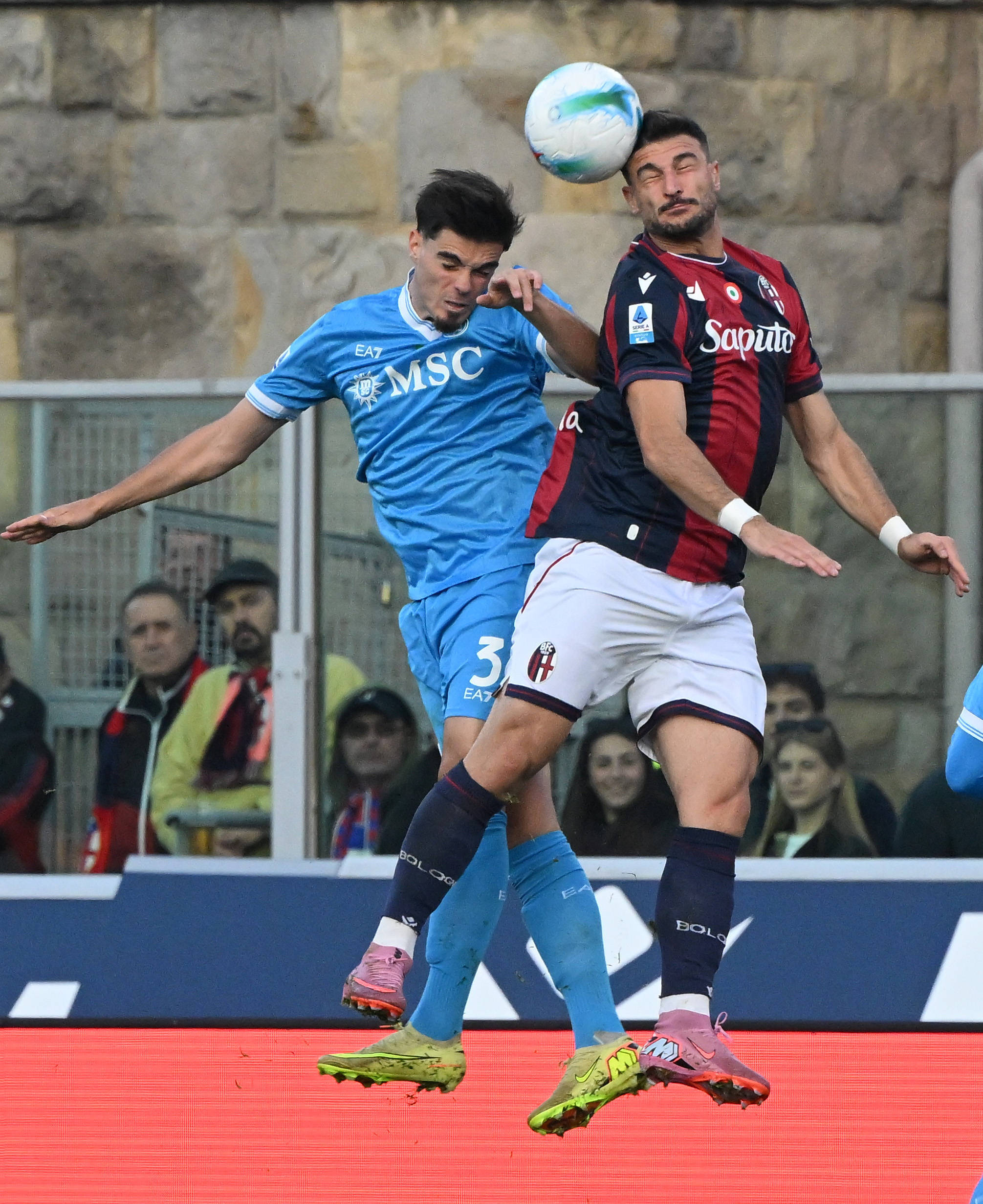 11月9日,博洛尼亚队球员奥尔索利尼(右)与那不勒斯队球员古铁雷斯在比赛中争顶。 新华社发(阿尔贝托·林格利亚摄)