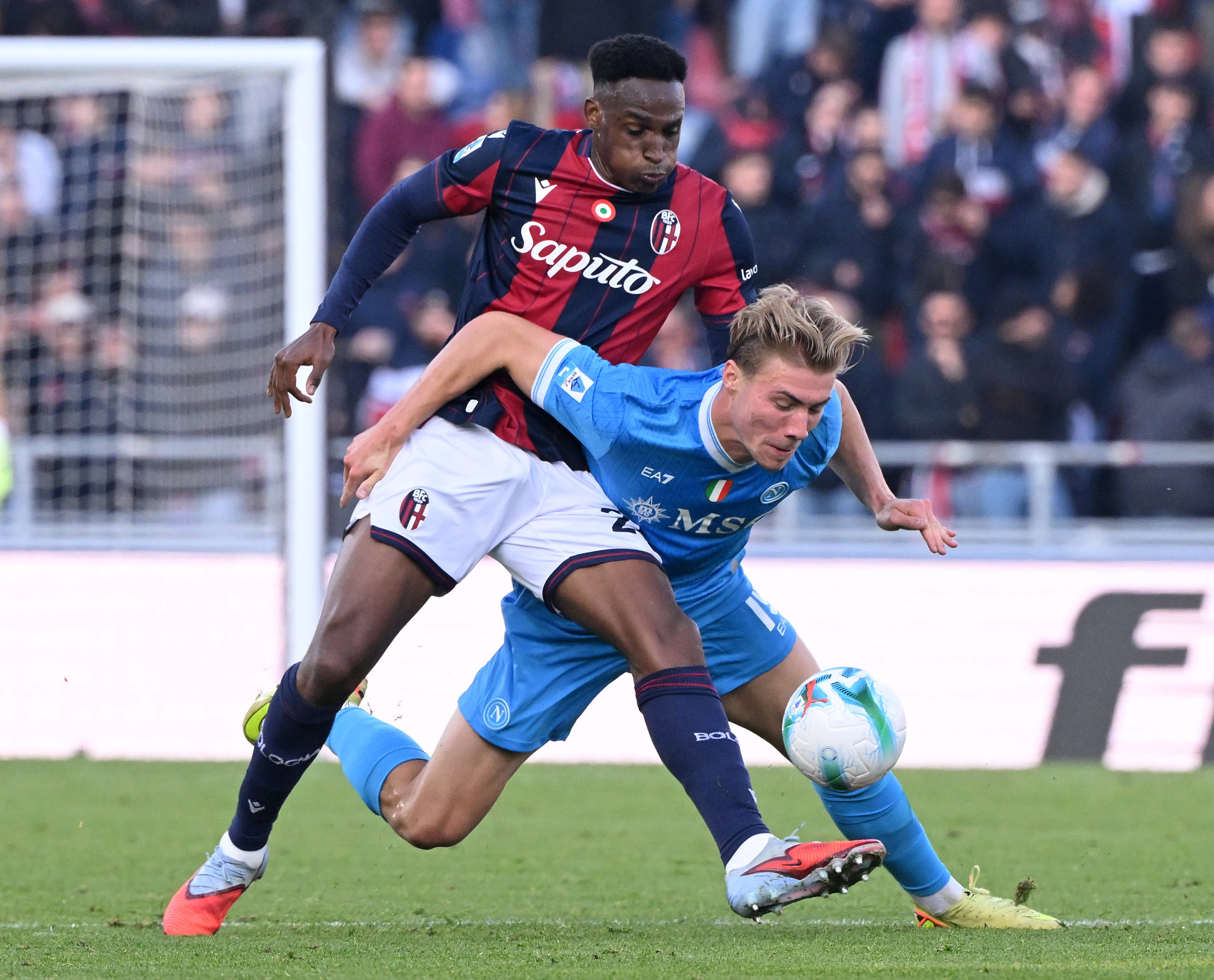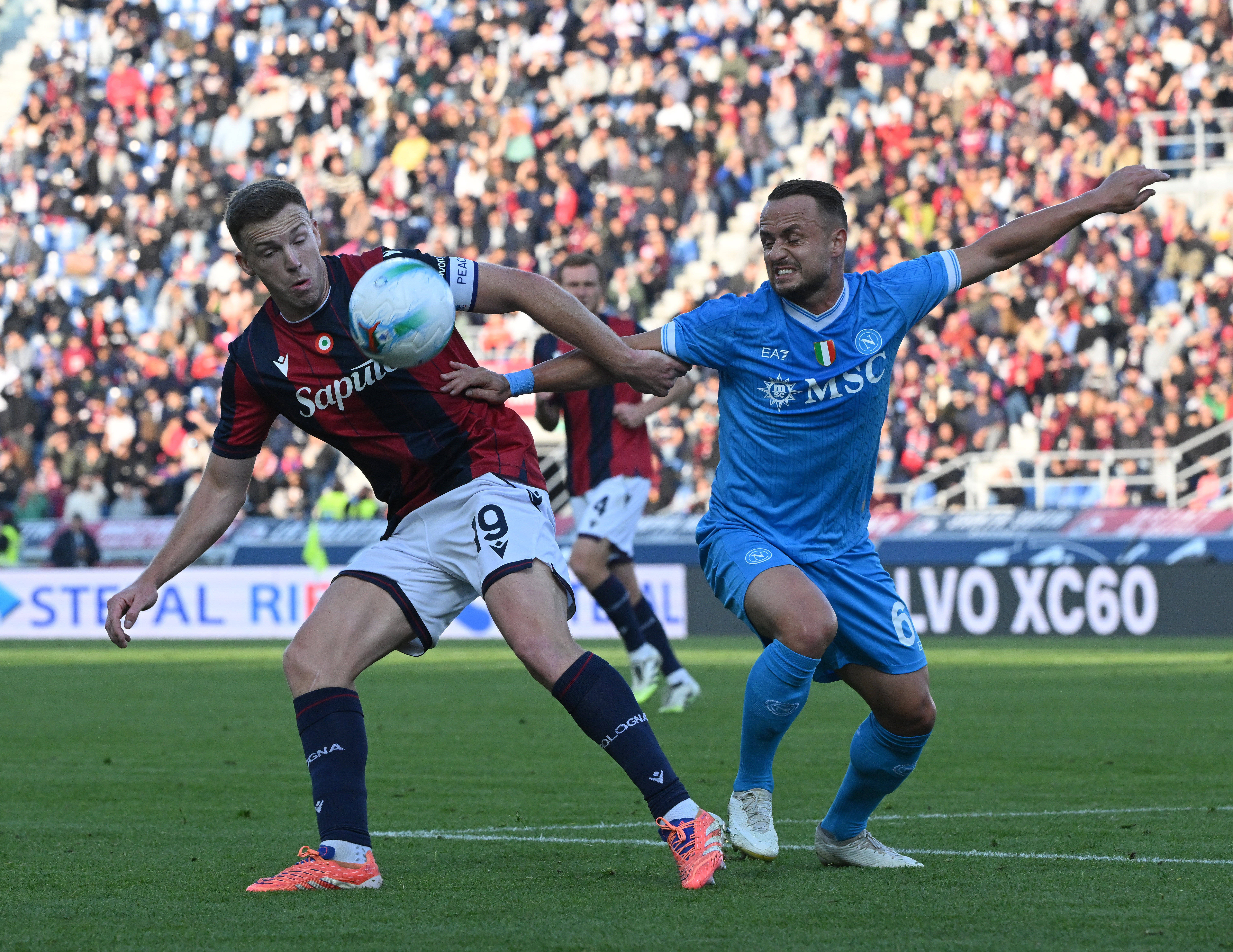 11月9日,博洛尼亚队球员弗格森(左)与那不勒斯队球员洛博特卡在比赛中拼抢。 新华社发(阿尔贝托·林格利亚摄)