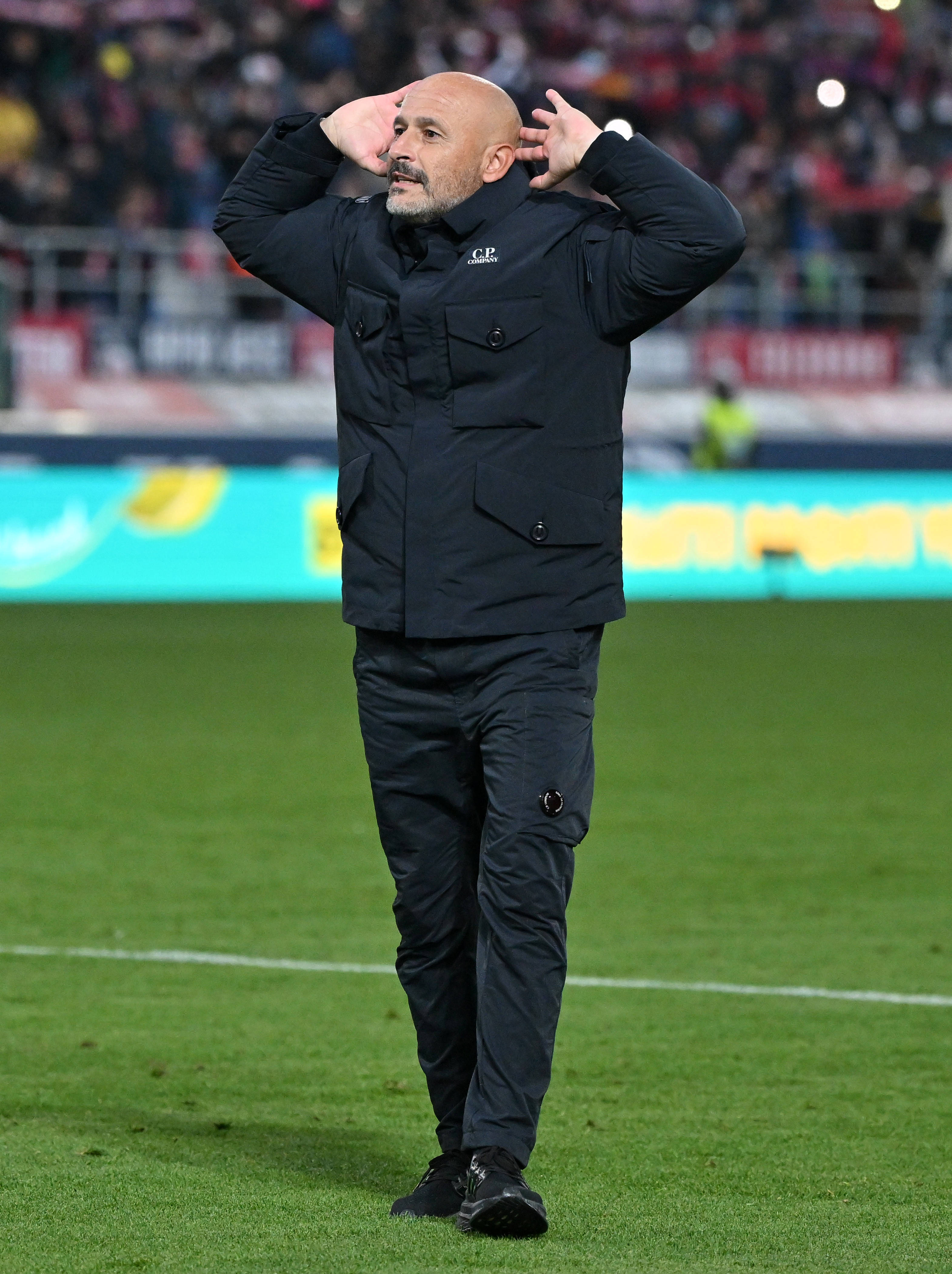 11月9日,博洛尼亚队主教练意大利诺在赛后庆祝。 新华社发(阿尔贝托·林格利亚摄)