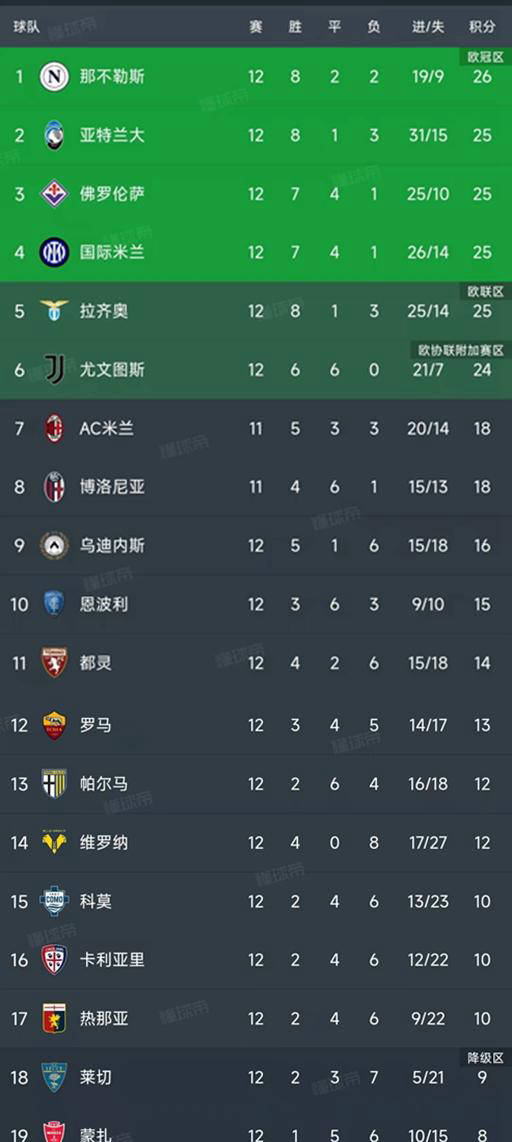 意甲直播,意甲赛程,意甲积分榜,尤文图斯直播,意甲比分预测/面向中文球迷的意甲资讯平台,涵盖2025赛季完整赛程、免费高清直播入口、积分榜更新与竞彩波胆预测,聚焦尤文、国米、米兰三大豪门赛事。北京时间11月12日,本赛季的意甲已经进行完了所有的第12轮比赛,现在让我们一起来看看最新的积分榜动向!前6名球队之间的积分差距只有2分,争冠区和争取欧冠资格的竞争可谓异常激烈,而处于保级区的第15名到垫底的球队之间也仅相差2分。