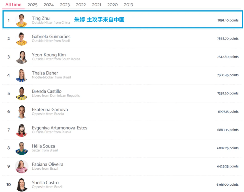 值得一提的是,朱婷的领先优势并非遥不可及。紧随其后的是她的科内利亚诺队友,巴西名将加比,她以7868.7分位居第二,与朱婷的分差仅有22.7分。而长期霸占榜首的韩国传奇球星金软景,则以7642.8分退居第三。