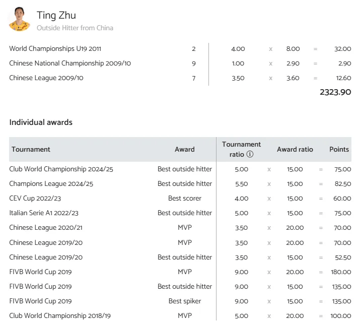 那么,是什么成就了朱婷的榜首位置?细究她的积分构成,便不难发现,朱婷的积分来源于她在国家队和俱乐部层面所取得的无数辉煌成就。国家队层面,她曾带领中国女排斩获奥运会冠军、世界杯冠军、世锦赛奖牌、亚运会冠军、亚洲杯冠军等荣誉。俱乐部生涯同样精彩,她曾效力于中国联赛、瓦基弗银行、斯坎迪奇和科内利亚诺等多支豪门球队,多次捧起世俱杯、欧冠奖杯以及联赛冠军。