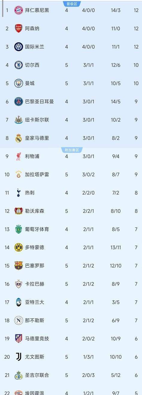 欧冠联赛阶段的积分榜因此发生了显著变化。曼城虽然失利,但仍积10分排名第6位,勒沃库森取胜后积8分升至第13位。