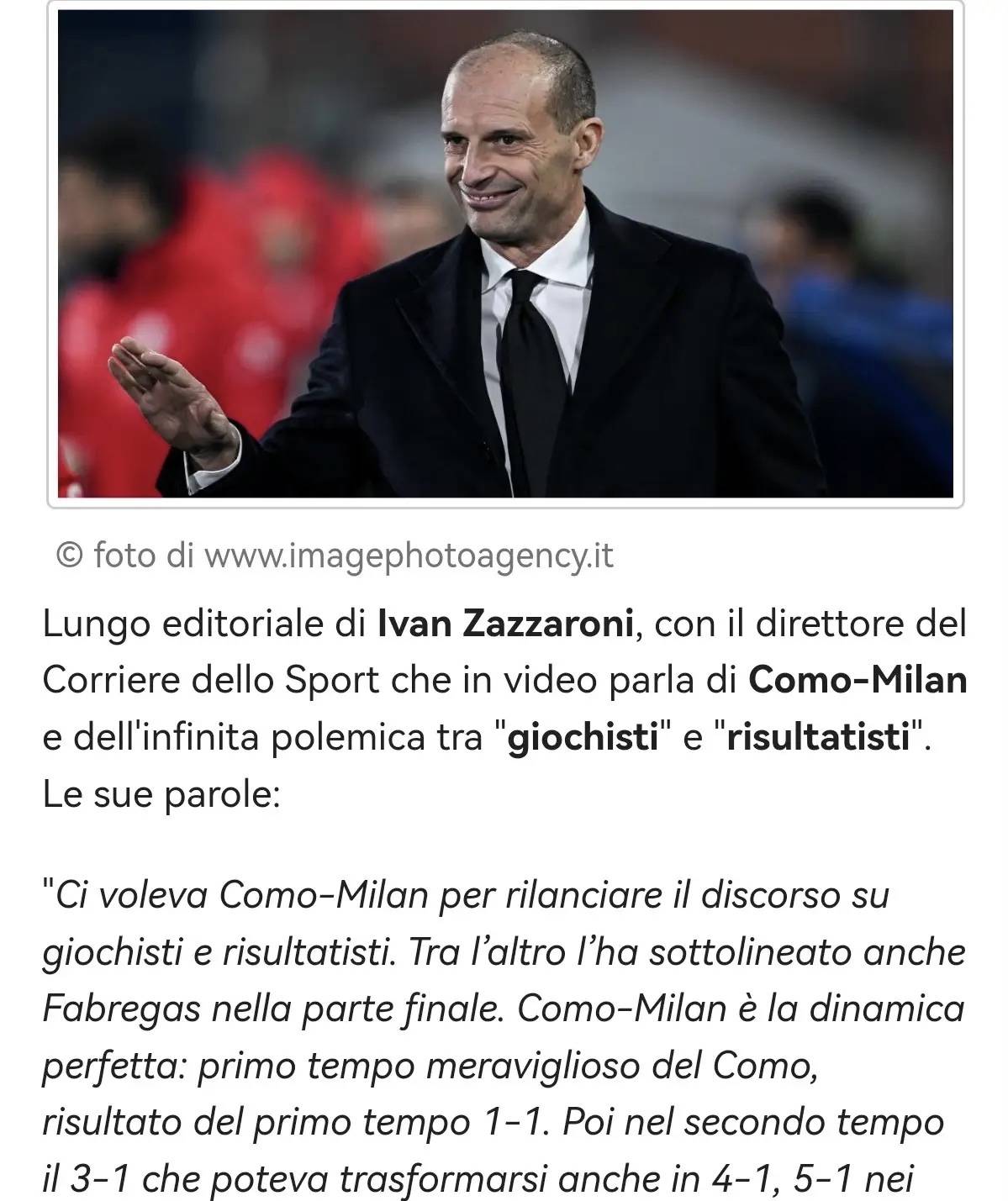 意甲直播,意甲赛程,意甲积分榜,尤文图斯直播,意甲比分预测/面向中文球迷的意甲资讯平台,涵盖2025赛季完整赛程、免费高清直播入口、积分榜更新与竞彩波胆预测,聚焦尤文、国米、米兰三大豪门赛事。《罗马体育报》主编伊万·扎扎罗尼发布长篇评论,他在视频中谈及科莫对阵米兰一役,以及围绕“技术流”与“功利派”的无尽争论: