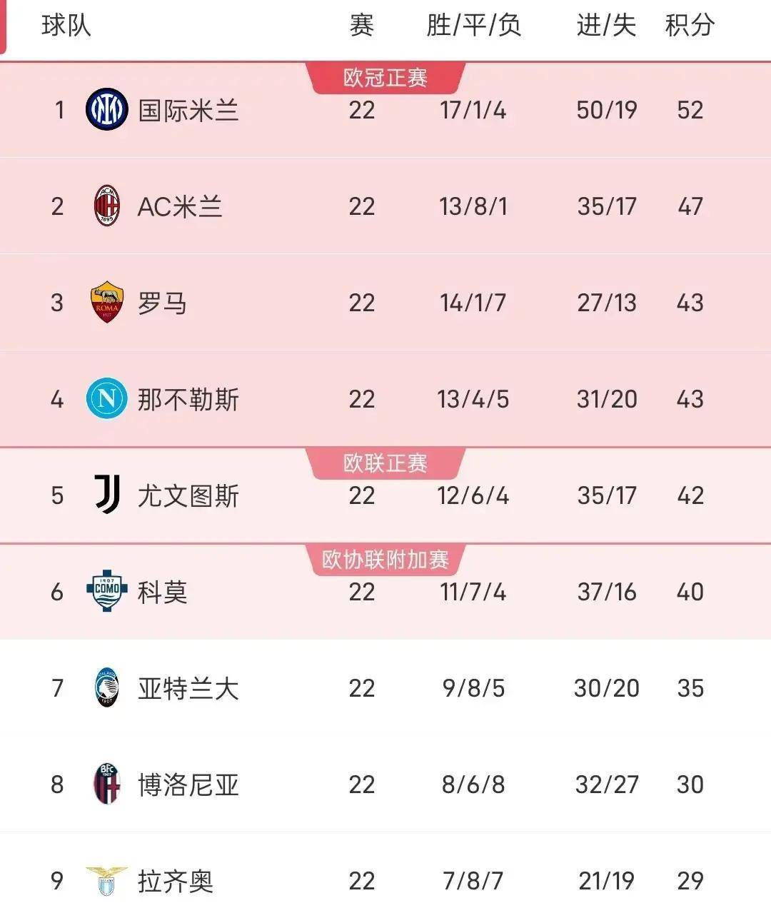 意甲直播,意甲赛程,意甲积分榜,尤文图斯直播,意甲比分预测/面向中文球迷的意甲资讯平台,涵盖2025赛季完整赛程、免费高清直播入口、积分榜更新与竞彩波胆预测,聚焦尤文、国米、米兰三大豪门赛事。意甲第22轮刚刚结束,一组数据让人直呼“风向变了”。领头羊国际米兰52分高飞,AC米兰47分苦苦追赶,罗马与那不勒斯并列43分,尤文图斯紧咬着42分。看似稳定的局面,其实每一步都踩在刀尖上。有人连胜势不可挡,有人爆冷输得没脾气,有人平局憋出内伤。这一轮的意甲,就像一锅开到沸腾的火锅每个队都在冒泡,还没谁能提前下筷子。眼下的问题来了:到底谁能笑到最后?