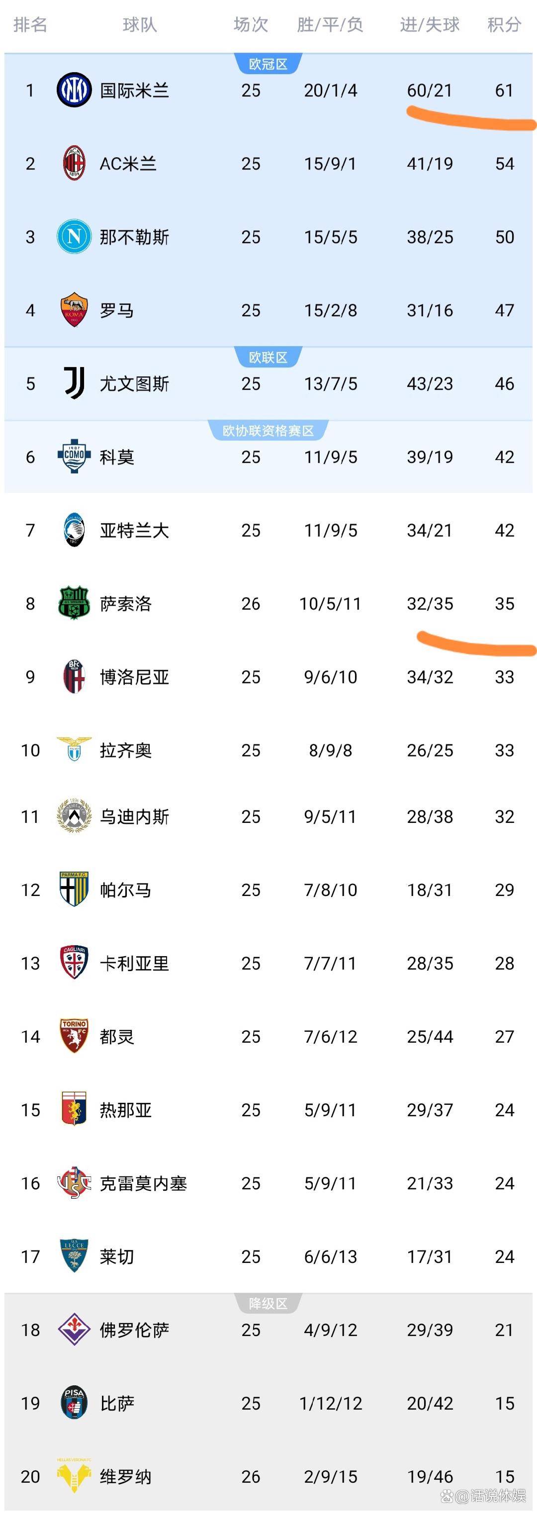 这场胜利对萨索洛来说,意义远不止三分。 赛前他们排名联赛第10,积32分。 赢下这3分后,他们的积分一下子涨到了35分,在即时积分榜上蹿升到了第8位。