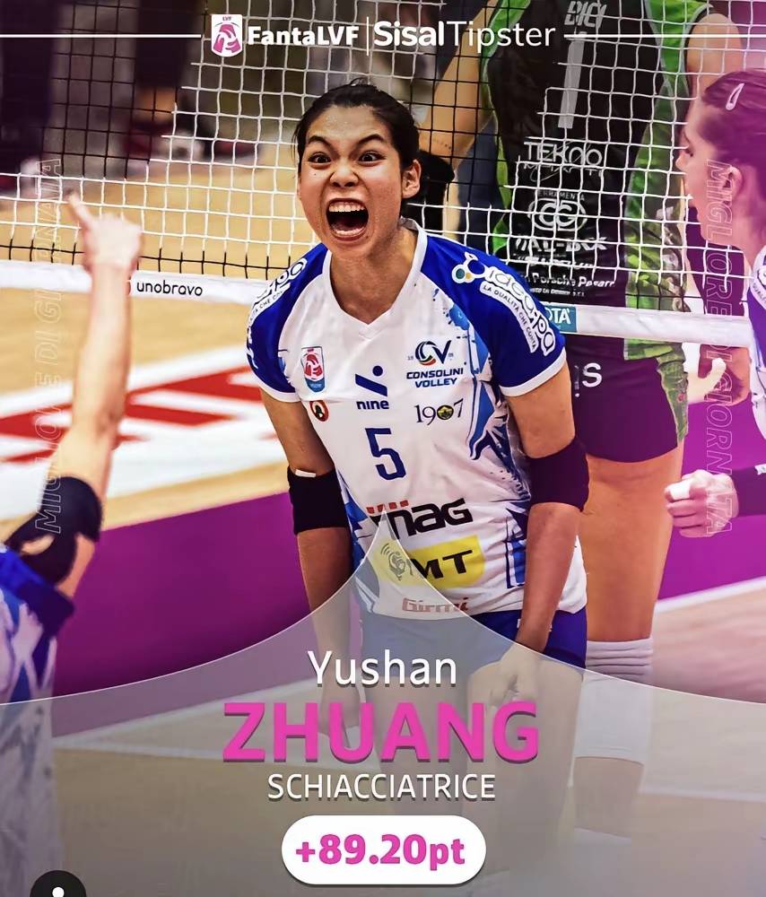 庄宇珊加盟圣乔瓦尼队,一个人引领一支队伍,扛着队伍走,硬是将面临降级的圣乔瓦尼队拉了回来,庄宇珊的表现得到了全世界球迷的认可。今年8月,庄宇珊将联袂吴梦洁在亚锦赛上大展拳脚,争取拿下冠军第一时间拿到进军洛杉矶奥运会的门票。