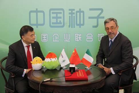 桑普多利亚足球俱乐部总经理朱塞佩·阿尔贝加尼和中国企业联合馆副馆长朱裕华交谈