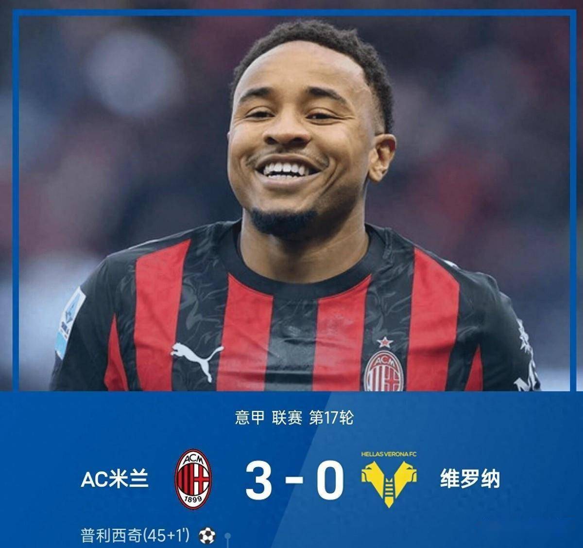 随后的比赛,AC米兰控制着场上的节奏,没有给维罗纳任何翻盘的机会。尽管第八十六分钟,客队曾打入一球,但因犯规在先被判无效。最终,3-0的比分保持到了终场。