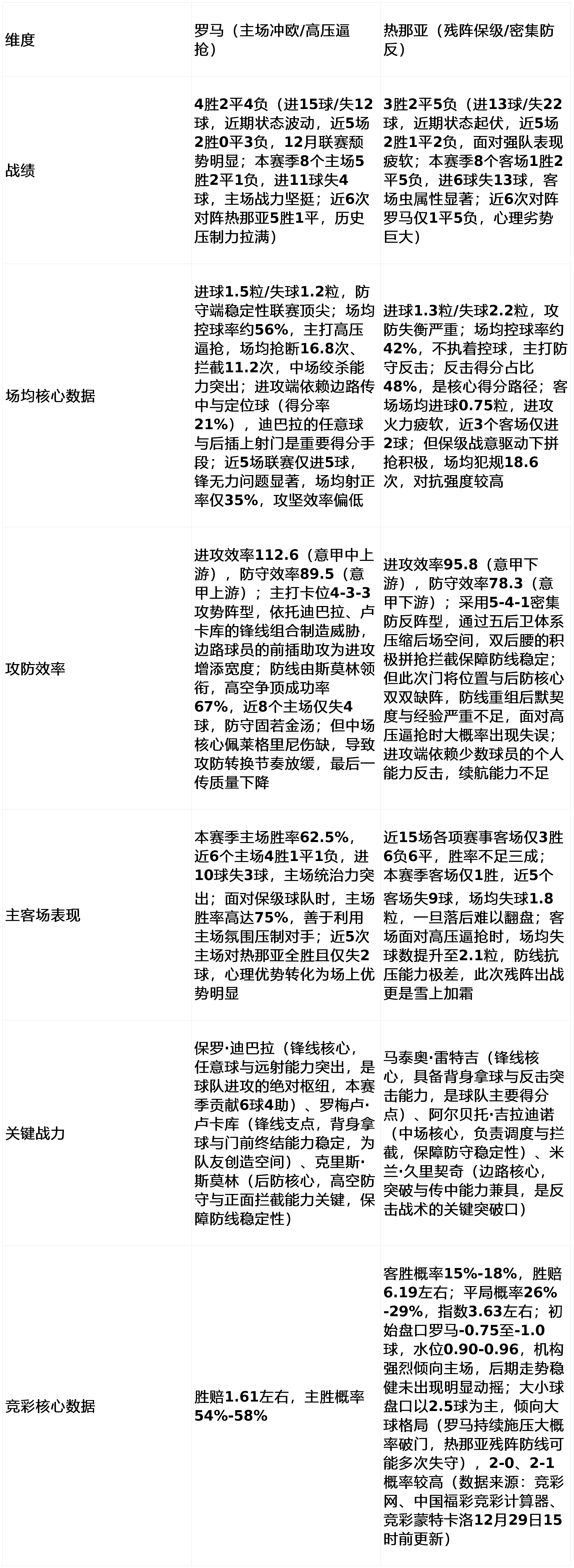 核心看点:罗马(积分榜第4,30分)本赛季前期表现抢眼,一度稳居联赛前三,但近期状态波动明显,近5场各项赛事输掉3场,12月4场联赛仅取得1胜3负的成绩,逐渐退出联赛前三名的位置,急需一场胜利重振士气。球队主打卡位4-3-3攻势阵型,依托主场优势主打高压逼抢,防守端极为稳固(16轮仅失10球,联赛第2好),但进攻端效率低下(场均仅1.1球),锋无力问题显著制约成绩;阵容方面遭遇伤病与停赛困扰,恩迪卡、尼尔·埃尔·艾纳奥伊因非洲杯或停赛缺席,佩莱格里尼、多夫比克等核心球员伤缺,中场组织与锋线火力受损。热那亚(积分榜第17,14分)仅高出降级区2分,保级压力巨大,换帅后曾在11月踢出短暂小高潮,但近期接连遭遇强敌后迅速被打回原形。球队主打卡位5-4-1密集防反阵型,力求通过防守反击与定位球寻求破局,客场表现有所提升(德罗西执教后3个客场2胜),但防线差);阵容方面堪称灾难,门将位置莱亚利红牌停赛、西格里斯特手指骨折,三门索马里瓦将迎意甲首秀;后防核心德温特红牌停赛,另有多名球员伤缺或停赛,防线近乎重组,经验与默契严重不足。历史交锋罗马呈绝对压制,近6次正式比赛交手5胜1平保持不败,本赛季首回合客场1-0小胜,近20次联赛对决仅输1场斩获14胜,热那亚最近一次客场击败罗马还要追溯到1990年,心理劣势极为明显。战术风格对冲鲜明:罗马主打高压逼抢+边路传中,热那亚主打密集防守+反击偷袭。竞彩初始开出罗马-0.75至-1.0球,胜赔1.61左右、平赔3.63左右、客胜6.19左右,机构强烈倾向主场,大小球盘口以2.5球为主,结合双方攻防短板,大概率呈现罗马主导进攻、热那亚残阵死守的格局。