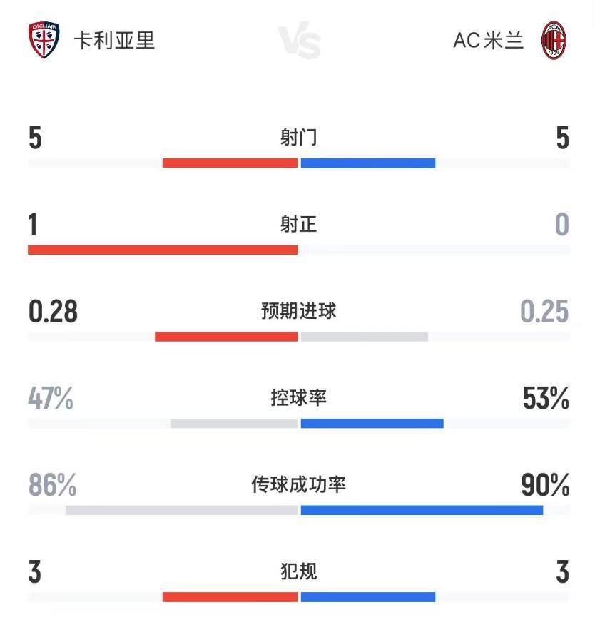 从上半场的数据来看,两队的射门次数都是5次,不过卡利亚里有1次打正球门,而AC米兰却0次射正。在控球率方面,AC米兰虽然有53%,但优势并不大。这么说的话,其实主场作战的卡利亚里反而有点占便宜。