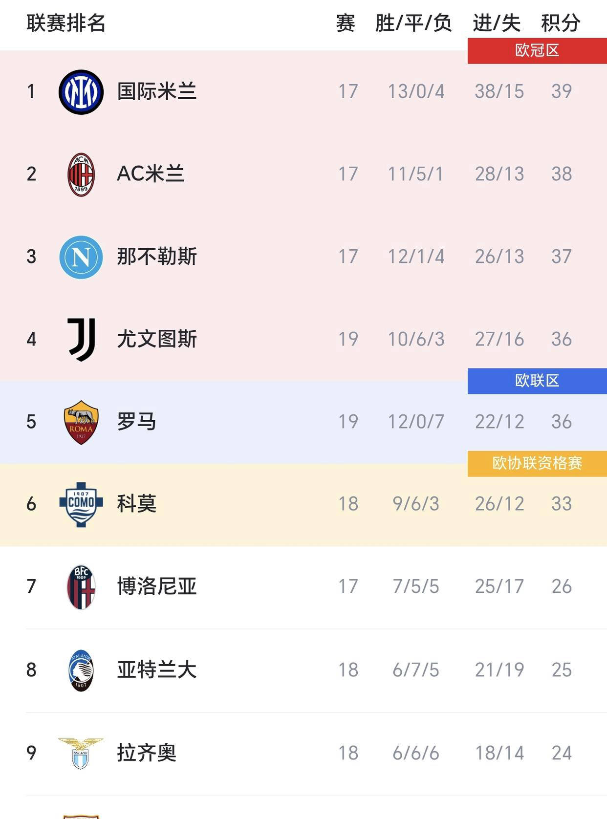 随着这三场比赛结束,本轮意甲积分榜出现了新的调整:尤文依旧稳居前列,科莫亦顺利保持欧战名次竞争力,而比萨和莱切则需加紧战斗以远离降级区。未来几轮比赛将尤为关键,更多精彩对决值得期待。返回搜狐,查看更多