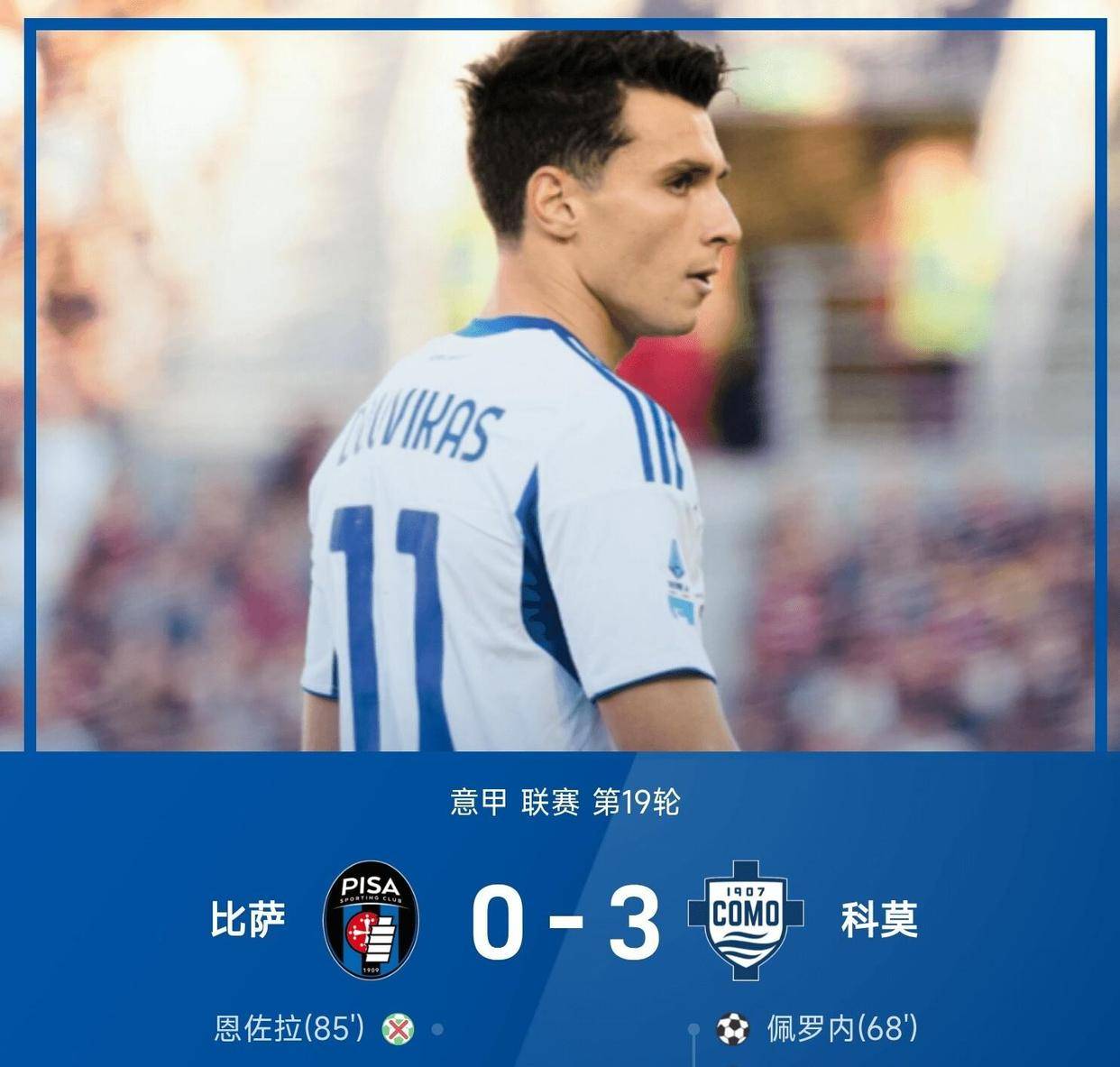 而这场比赛中最令人惊喜的球队,莫过于科莫。这支由前足球巨星法布雷加斯执教的队伍,在客场面对积分榜垫底的比萨。比赛的大部分时间都显得沉闷,尽管科莫掌握了较高的控球率,但却迟迟未能打开局面。僵局直到比赛的第六十八分钟才被打破。科莫在前场组织进攻,皮球被传递到禁区弧顶,无人盯防的佩罗内停球调整一步,随即起脚一记冷射,皮球如同出膛炮弹般直飞球门左上角,比萨门将对此毫无反应,科莫1比0领先。